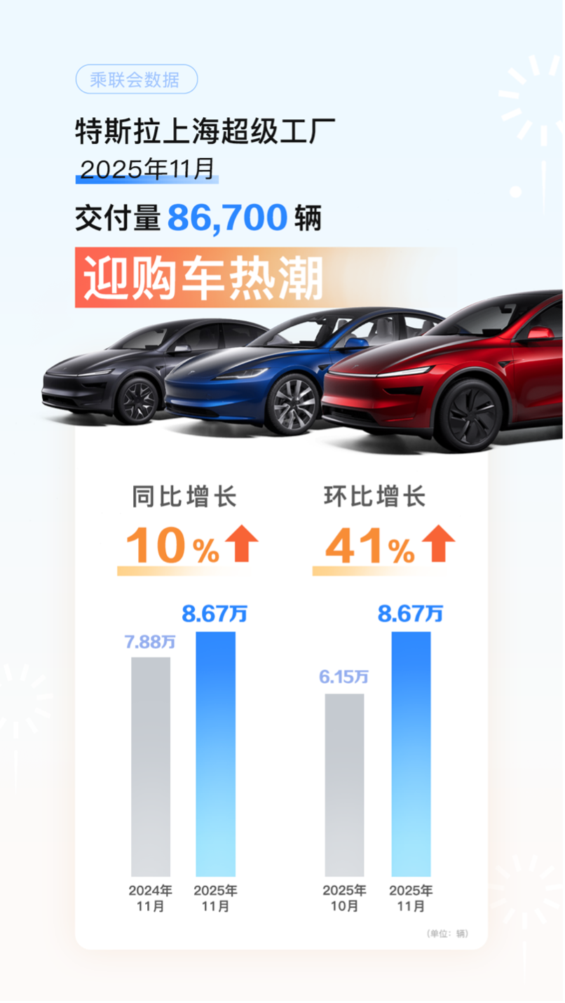 中国乘用车联合会12月2日公布的最新数据显示,11月特斯拉上海超级工厂共交付Model 3和Model Y 86,700辆,同比增长10%,较10月环比增长40%。