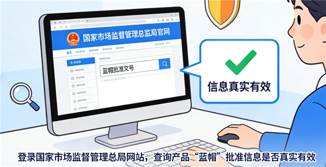 查资质: 登录国家市场监督管理总局网站,查询产品“蓝帽”批准信息是否真实有效。