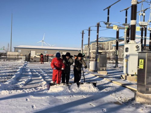 在大安海坨风电场,运维团队细致清除设备操作机构箱、控制柜周围积雪,并用软毛刷清扫户外端子箱散热孔,防止积雪影响密封散热与装置可靠运行;在主变压器区域,沿着瓦斯继电器、油温表及冷却器控制柜周边清出了一条巡检线路。同时,另有4名运检人员排成两列,合力将巡检主干道上的积雪推至两侧。生活区内,同步开展的综合楼周边清扫、台阶防滑垫铺设及通行区域融雪剂撒布工作也在有序进行。其他人员也分赴光伏电站和地热项目,对汇流箱周边、地热项目场区道路进行同步清扫。经过近5小时连续奋战,各场站内外关键道路、设备区域及生活通道积雪全部清理完毕,确保应急抢修与日常巡视路线畅通无阻,为寒潮期间的设备维护与应急处理铺就了安全高效的“绿色通道”。