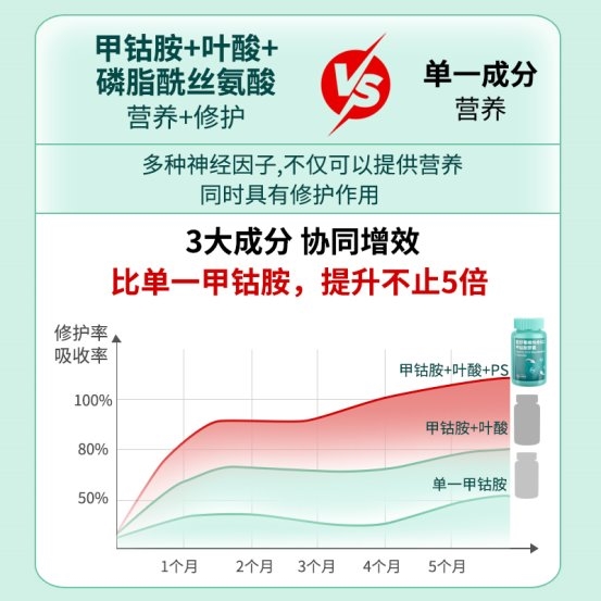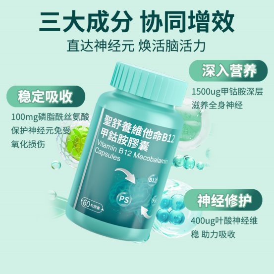 科学复配甲钴胺、叶酸、磷脂酰丝氨酸三大核心成分,功效一加一大于二,打破单一成分补充的局限性。每粒富含1500微克高活性甲钴胺,直透神经屏障,精准修复受损神经元;同时配比400微克叶酸,促进神经递质合成并降低同型半胱氨酸,它能显著降低神经损伤的风险;特别添加100毫克磷脂酰丝氨酸,精准作用于神经细胞膜进行修护,让神经信号传递像“高速通路”般顺畅。三者强强联合,打造“补能 — 修护 — 稳代谢”的营养闭环,让神经修复事半功倍。