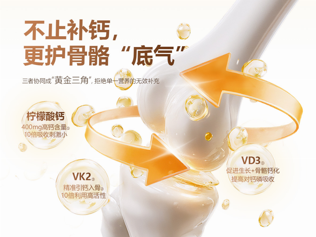 2.成分筛选关注有机柠檬酸钙、专利VD3与全反式VK2的黄金协同组合,判别协同吸收效率和创新技术实力,杜绝低效“噱头”成分。