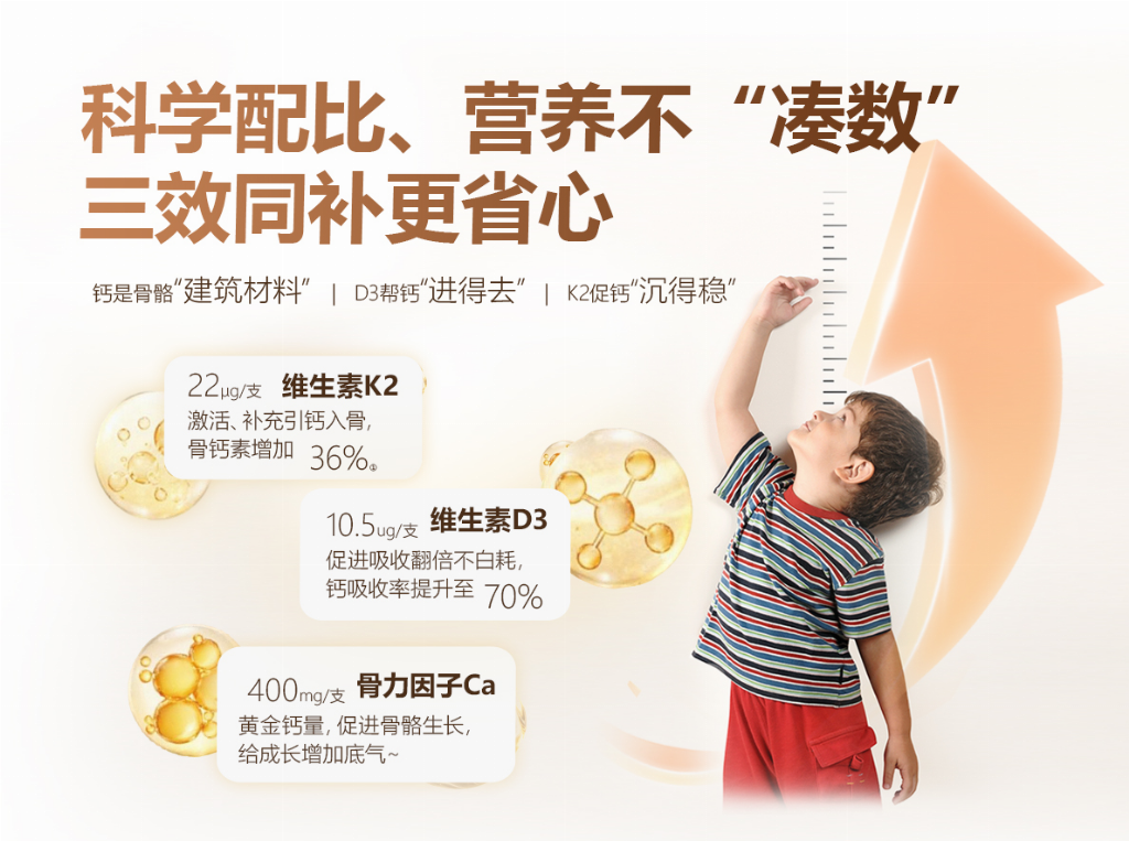 400mg微米级柠檬酸钙为骨骼提供“建筑材料”,10.5μg专利VD3显著增加肠道对钙吸收效率至70%,22μg全反式发酵VK2作为钙的“导航员”,精确引导沉积骨骼,激活骨钙素提升36%,杜绝血管、关节等非骨组织异常钙化。钙+VD3+VK2黄金三角突破传统补钙短板,“进得去、用得上、沉得稳”,相比单补钙/VD3产品协同更显著,免疫力、骨密度、身高增长提升明显,减少骨质疏松及牙齿松动等风险。