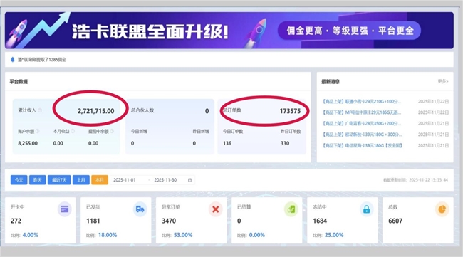 浩卡联盟后台系统可以实时同步订单状态。用户下单、开卡激活、在网状态以及佣金生成情况都可以在后台查看。