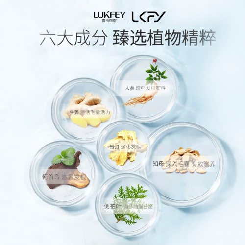 2. 深层养发修护:防脱的核心是养根,露卡菲娅通过“人参+当归+知母”的植萃复配体系,为毛囊提供全周期营养供给。其中人参皂苷可改善头皮微循环,加速营养输送;当归活血养血,筑牢头皮健康生态基础;知母皂苷平衡头皮菌群,减少炎症对毛囊的损伤,三者协同让毛囊焕发活力。同时添加泛醇(维生素B5),能深入发丝修护毛鳞片,经头发拉力测试仪检测,可提升发丝抗拉强度52%,有效减少断发、干枯问题,实现“养毛囊、强发丝”的全面养发效果。
