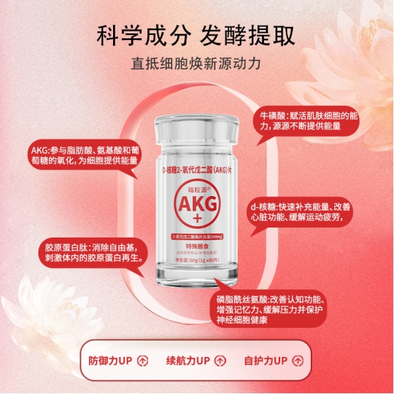 (1)核心活性成分:以高纯度2-氧代戊二酸为核心,每片含量达500mg,远超行业平均水平,为细胞自噬和NAD+合成提供充足原料;复配D-核糖,可加速ATP再生,与AKG协同强化细胞能量供给,缓(2)协同增效成分:添加牛磺酸调节细胞内环境平衡,增强抗氧化能力;胶原蛋白肽靶向补充皮肤结构蛋白;磷脂酰丝氨酸中枢赋能,焕活神经细胞功能;雨生红球藻则以天然虾青素提供高效抗氧化防护,能穿透细胞屏障,在内部形成立体防护网络。它不仅强力中和自由基,更能稳定细胞结构,从根源上强化防御。