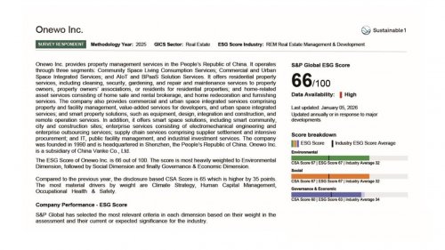 2026年1月5日,标准普尔全球(S&P Global)发布2025年度万物云可持续发展评估(CSA)报告。报告显示,本次评估数据具备较高的透明度,万物云空间科技服务股份有限公司(HK.02602)ESG评分为66分,较上一年度实现较大跃升。