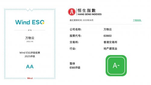 此外,本年度万物云WIND万得ESG评级上调至AA级,香港恒生指数ESG评级上调至A-级,均在行业处于领先地位。