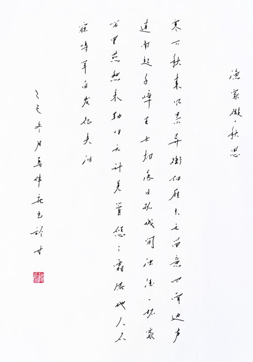 - 《渔家傲·秋思》 以原野行书流畅为基调,搭配田英章楷书的精准与启功的瘦硬笔锋,行笔迅疾却守法度,细劲牵丝与厚重主笔形成鲜明对比,字势随边塞词的苍凉意境起伏,尽显“因文造境”之妙。