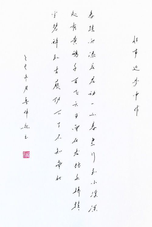 - 《好事近·梦中作》 取法文徵明的温润秀逸,依托田英章楷书的精巧结构,线条圆润婉转,锋芒隐于笔画之中,字形小巧玲珑,留白与牵丝交织出梦境的朦胧诗意,是“以柔驭刚”的典范。