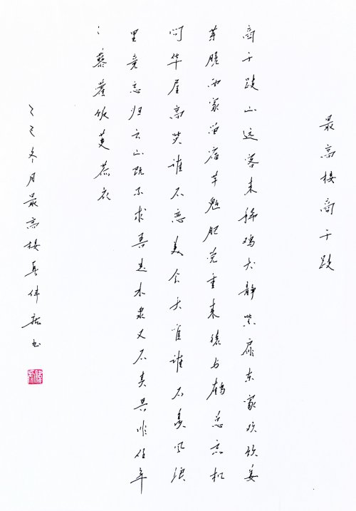 - 《最高楼·商于路》 以启功瘦硬挺拔立骨,融田英章楷书规整之形,兼采文徵明雅致与原野行书豪放笔势,更添汉隶宽博与魏碑方折之意,用笔方劲古拙,结体开阔大气,将豪放词的壮志豪情展现得酣畅淋漓。