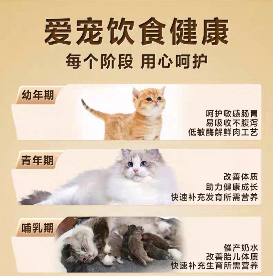 电商平台好评率≥92%,长期喂养反馈中无“软便”“挑食”“泪痕加重”等集中投诉。全阶段猫粮需覆盖幼猫、成猫、老年猫的差异化需求,功能性猫粮(如美毛、护泌尿)需有明确的成分支撑(如美毛粮含鱼油+蛋黄粉,护泌尿粮含蔓越莓+车前子)。