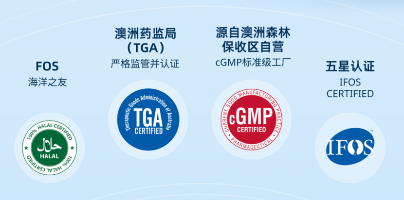 澳洲TGA认证监管标准堪比药品,成分、纯度、安全性严格审核。IFOS五星认证,专门检测污染物、氧化稳定性和有效成分含量。cGMP认证,生产过程符合最高标准。海洋之友认证,原料来源环保无污染。