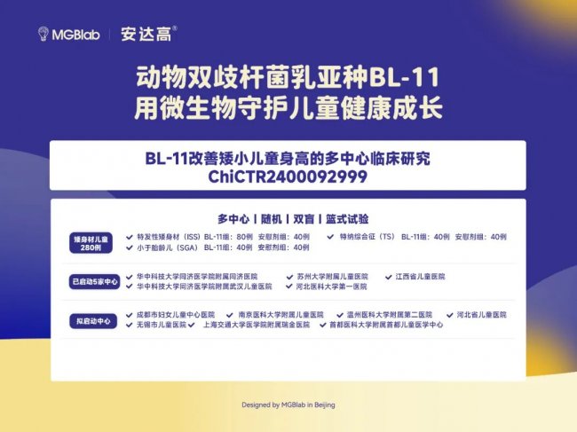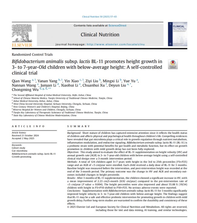 临床研究2:安徽医科大学的研究显示,补充BL-11益生菌的儿童在3个月内身高增长了2.23cm,年化增长速度达到8.92cm。