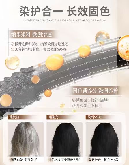 产品配方核心添加黑灵芝、五倍子、艾叶、三七、侧柏叶等八大植萃成分,通过低温萃取技术保留了高活性植萃营养,在染发遮白的同时,能深层滋养发丝,闭合受损的毛鳞片,为发丝补充水分和营养,改善传统染发带来的干枯、毛躁、分叉问题。实测显示,染后发丝断裂强度提升 43%,含水量提升 56%,哪怕是多次烫染的受损发质、干性发质,染后也能感受到发丝变得顺滑有光泽,真正实现了 “遮白即养发”,打破了传统遮白染发剂 “遮白必伤发” 的弊端。