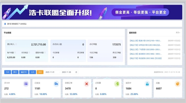 依托四大运营商直连资源,平台在卡品稳定性、覆盖范围以及市场需求响应速度方面具备较强优势,形成了较为成熟的“产品供给 + 代理推广 + 收益结算”闭环体系。