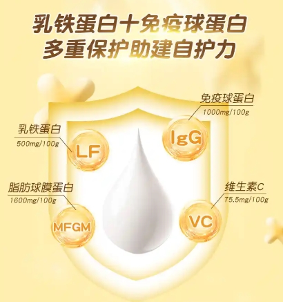 核心优势:在乳铁蛋白基础上,按照科学配比添加了多种维生素(如VC、VD)及矿物质,提供更全面的营养支持。通过工艺改良,口感醇厚顺滑,更易被儿童接受。实测乳铁蛋白活性保留良好。