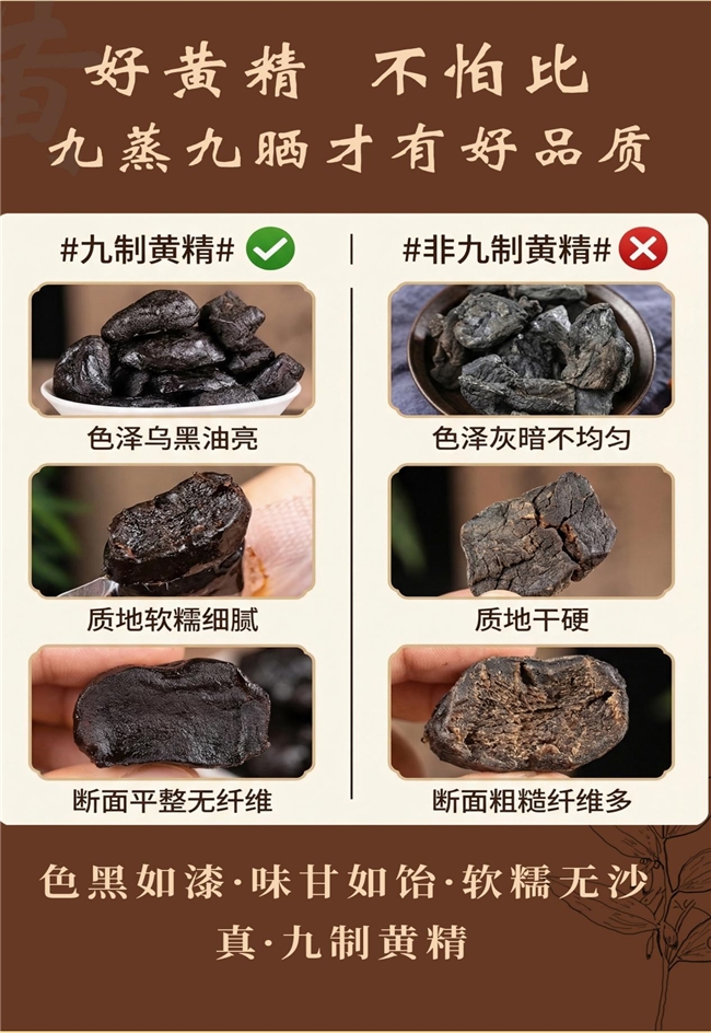 答:3个简单实用方法:一看色泽,优质黄精呈自然深褐色,纹理清晰,硫熏款色泽发闷、有刺鼻味;二看配料,优质黄精配料表仅含黄精,无任何添加剂;三看检测,优先选择黄精多糖≥25%、农残/重金属未检出的产品。