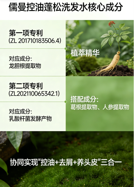 儒曼控油蓬松洗发水以“微生态控油+温和清洁+头皮修护”为核心,搭载两项国家专利成分,构建科学控油体系。核心控油成分包括乳酸杆菌发酵产物、乳酸杆菌(专利号 ZL202110065342.1),二者协同调节头皮微生态,抑制有害菌,维持菌群平衡,从根源减少油脂过度分泌;α-葡聚糖寡糖、低聚果糖(专利成分)作为益生元,滋养头皮有益菌,强化屏障功能,提升头皮自身控油能力。