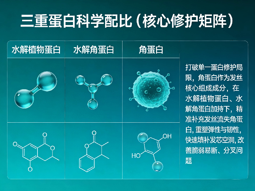 - 填补空洞:水解蛋白、多肽等成分渗透发芯,填补因烫染、热损伤导致的角蛋白流失形成的空洞,提升发丝强度。比如黛熙梦臻萃修护发膜中添加的三重蛋白(专利水解植物蛋白ZL202310347072.2、水解角蛋白、角蛋白),就是通过科学配比,精准填补发芯空洞,这也是其修复力突出的核心原因之一。