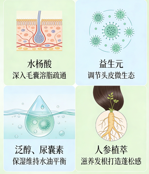 核心控油成分搭配科学,水杨酸深入毛囊溶解多余油脂、疏通堵塞,泛醇补充发丝水分,避免控油后干涩毛躁;葛根、知母等植萃精华辅助收敛控油,人参提取物滋养毛囊,多重成分协同作用,实现“控油+补水+修护”三位一体,打破“控油必干涩”的痛点。成分表透明可查,无硅油、无SLS/SLES,通过敏感性头皮测试,适配各类油头人群。