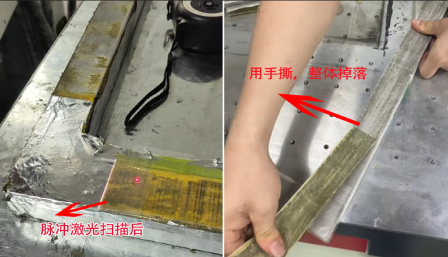 脉冲激光(平顶光)具有一定穿透力,铝合金基材吸收激光能量后产生高频振动及轻微发热,导致环氧树脂胶层与铝合金基材之间的粘附力大幅下降,胶层失去牢固附着力,通过人工施加轻微外力(手撕)即可实现整体脱离。因激光能量主要作用于基材与胶层界面,未对胶层进行彻底气化,故存在少量残胶残留。