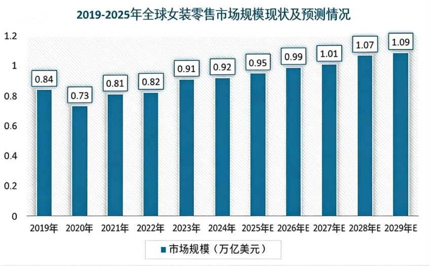 女装作为全球服装产业中规模最大、活力最强、变化最快的核心赛道,其市场规模最大、创新活力最强且潮流更迭最为迅速。目前,全球女装市场正稳步扩张,不断刷新规模纪录,而增长的主要驱动力正逐渐向亚洲转移,其中中国市场尤为突出。