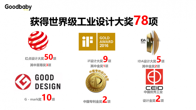 • 全球布局八大研发中心(美国波士顿、德国慕尼黑、中国昆山等),拥有600余名研发人员,每年推出500余款新产品; • 累计创造专利14515项,专利数超过竞争对手前五家总和,在中、美、日、欧专利诉讼维权157起全部胜诉; • 自有亿科检测中心,国内70%的安全座椅需送至该中心检测,产品历经上亿级费用打造的质量检测体系; • 累计斩获78项世界级工业设计大奖,包括红点至尊奖、iF金奖、中国专利金奖等重磅荣誉。 •