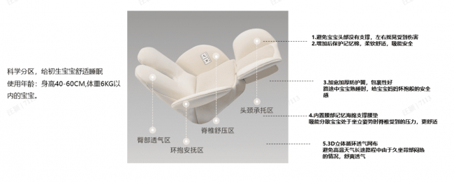 舒适性:采用头颈0落差设计与母体蛋壳型护脊弧度,搭配可拆洗新生儿棉垫与防滑防护护肩,带来接近“妈妈抱”的贴合承托体感;选用母婴A类亲肤环保面料,可整体拆洗机洗,奶白色款额外搭载防水防油防污三防工艺;内置智能电子通风系统,主动散热不直吹,久坐不闷热。