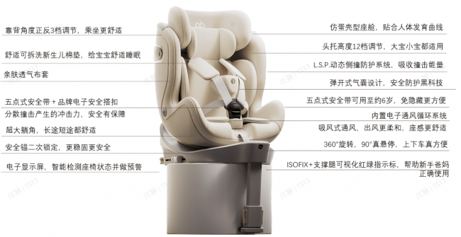 主打轻量化设计的国内新锐品牌,全系通过国标3C与UNR129双认证,核心搭载高密度吸能骨架与一键360°旋转专利,产品支持折叠便携收纳,适配网约车、跨城租车等灵活出行场景,是有便携收纳需求、预算有限家庭的入门选择。