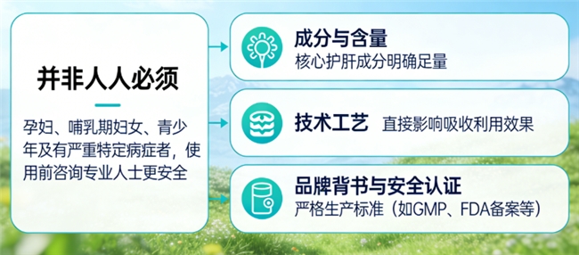 答:并非人人必须。孕妇、哺乳期妇女、青少年及有严重特定病症者,使用前咨询专业人士是更安全的做法。购买时,可以重点关注:一是成分与含量,核心护肝成分是否明确足量;二是技术工艺,这直接影响吸收利用效果;三是品牌背书与安全认证,如是否有严格的生产标准(如GMP、FDA备案等)。