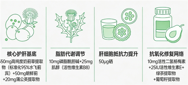 答:关键看“配方逻辑”。有的产品侧重单一高含量成分;有的则注重科学复配,从多维度协同支持肝功能,比如同时关注基础养护、脂肪代谢调节、抗氧化等多条通路。后者往往设计更系统,适合追求综合养护效果的人群。