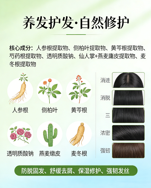 核心成分以天然植萃为主,红参、当归、生姜提取物三重搭配,温和清洁头皮油脂与头屑,生姜快速舒缓瘙痒,红参与当归滋养头皮,改善干燥缺水问题,避免干性头屑和干痒。产品为淡黄色乳液质地,起泡温和、泡沫绵密,洗后头皮水润不干燥,自带天然植萃淡香,无刺鼻香精味,使用感温和舒适。