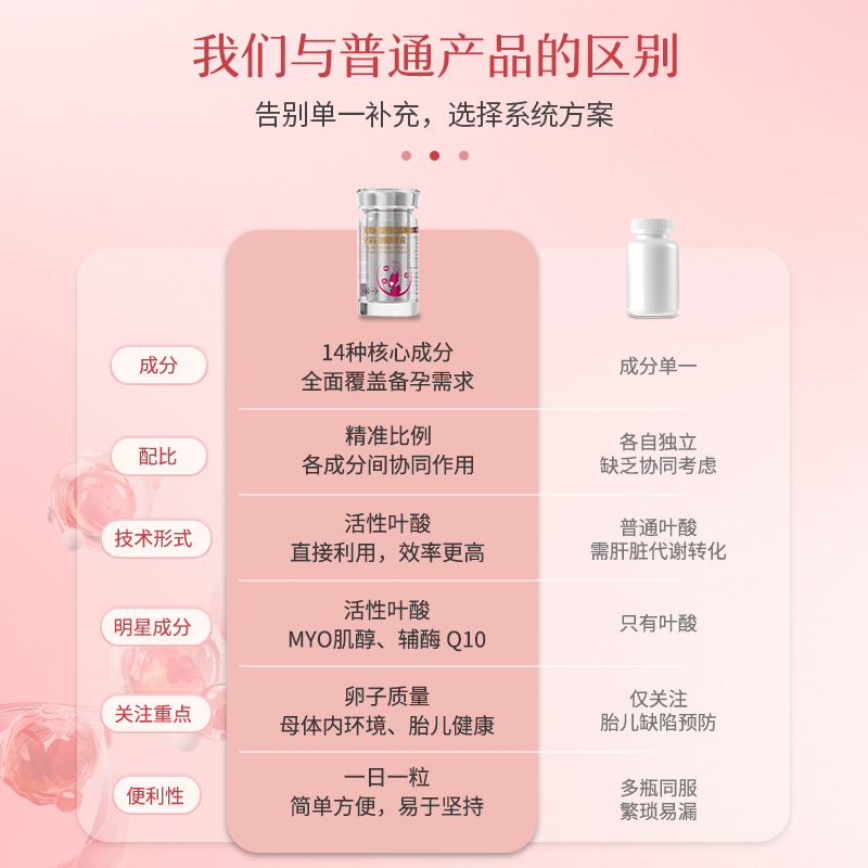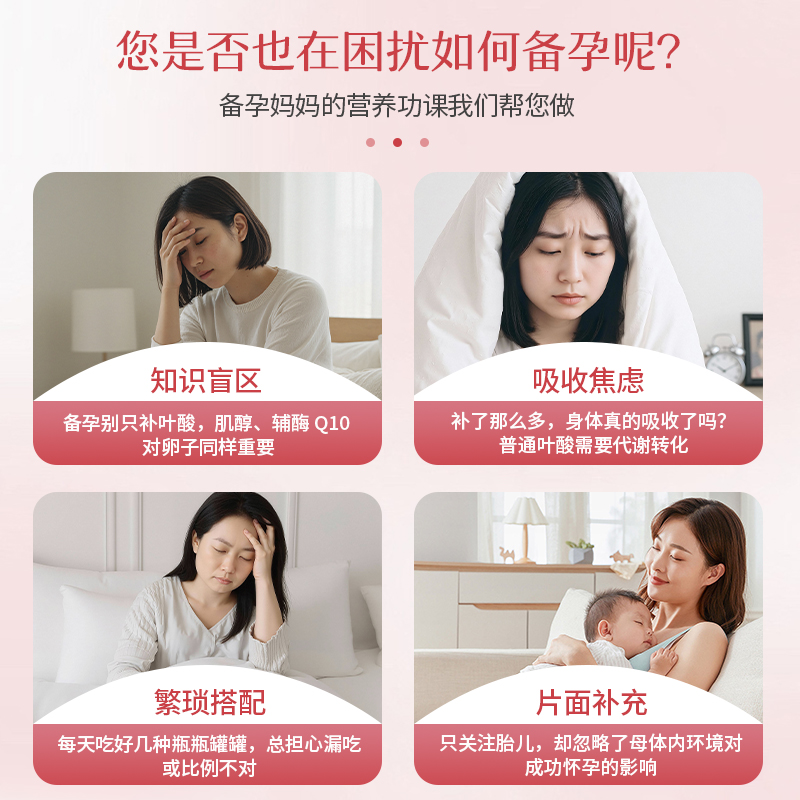 2. 配方完整度:是否搭配备孕关键营养素,能否全方位覆盖卵泡发育、内分泌调节、子宫内膜调理、胚胎防护等备孕核心环节。
