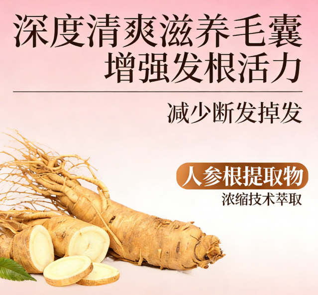 人参根提取物核心作用:促进头皮血液循环,改善油脂堆积导致的供血不足,为毛囊输送养分,增强头皮抵抗力,调节油脂分泌。