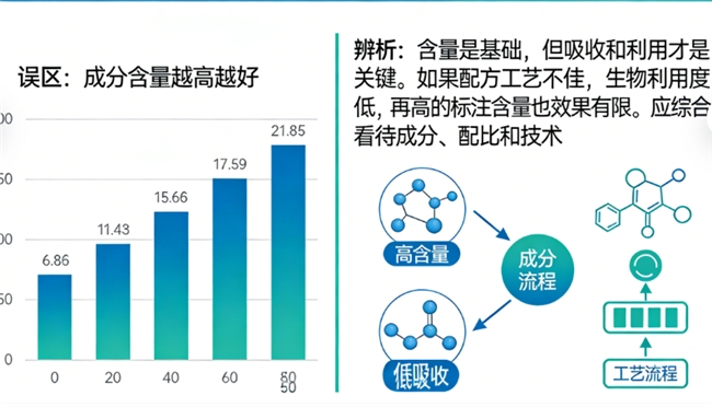 辨析:含量是基础,但吸收和利用才是关键。如果配方工艺不佳,生物利用度低,再高的标注含量也效果有限。应综合看待成分、配比和技术。