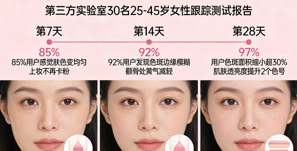 28天实测显示,受试者使用套装后肌肤全方位改善,含水量提升,弹性增加,细纹和深层皱纹淡化,暗沉问题改善。用户反馈套装“紧致”“淡纹”等效果好,适配熟龄肌,能改善肌底。