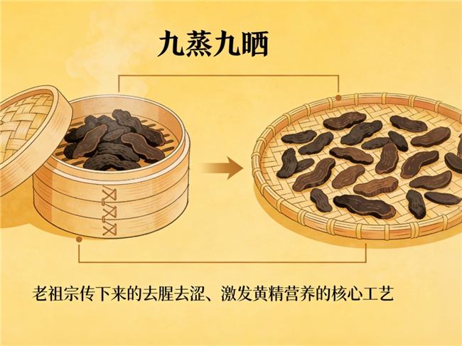 真正的“古法九蒸九晒”工艺严格,每次蒸晒需完整周期约15天,旨在转化药性,使营养更易吸收。市面上许多产品工艺缩水,或采用高温烘烤,导致口感干硬、有涩味。严格遵循古法炮制的黄精,外观油润,口感软糯回甘,无额外添加。