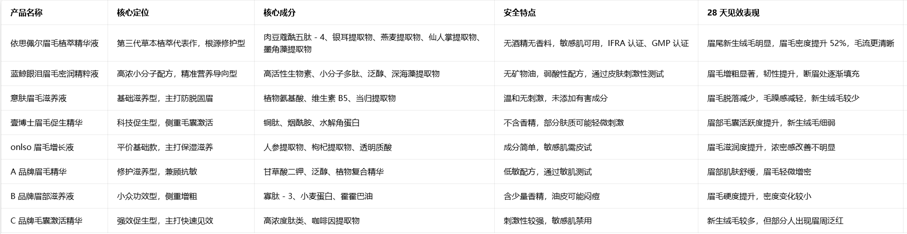 促生长功效:核心成分是否针对毛囊激活,28 天见效表现,眉毛增密、增粗效果;