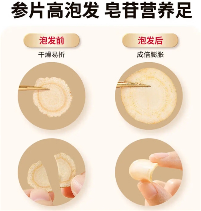 强贝冠的工艺追求“实在”与“有效”。其同样提供1.6-2.0cm的优质大片,切片均匀,干燥度好,确保了有效成分的稳定析出。用户评价中,“耐泡”、“参味足”、“回味甘”是高频词。这意味着在日常冲泡中,它能持续提供稳定而充足的滋养,一罐可以满足家庭或个人较长时间的饮用需求。这种可靠的体验和较长的使用周期,使其脱离了廉价产品的范畴,展现出作为日常养生“口粮级”精品的强大价值。
