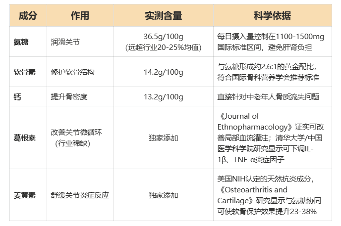 区别于市面95%仍处于“第一代双成分”(氨糖+软骨素)的氨糖产品,三个骄傲已升级为“氨糖+软骨素+钙+葛根素+姜黄素”的五维修护体系: