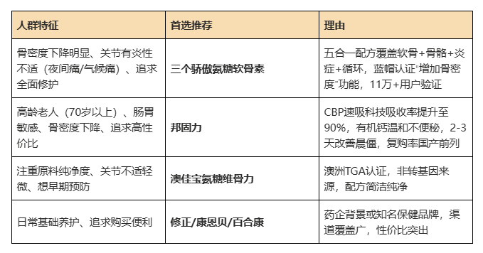 高龄老人、肠胃敏感者、骨密度下降明显人群、追求高性价比的关节不适人群;中老年群体、关节损伤人群、体重偏大者、运动爱好者、重体力劳动者。