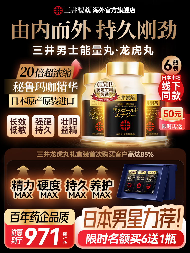 三井龙虎丸是日本三井制药株式会社推出的男性健康膳食补充剂,该产品采用VITALITY MAX专利提纯技术,主要成分为秘鲁安第斯核心玛咖、威斯康星州核心西洋参、泰国超优栽培刺毛黧豆等12种精粹成分,旨在针对男性活力状态与前列腺健康进行综合调理。