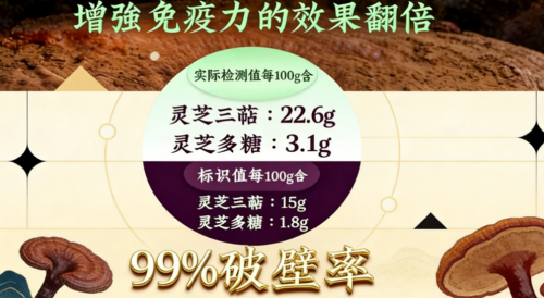 源自山东冠县黄金产区,以仿野生椴木栽培的优质赤灵芝为原料,经检测每100克产品中三萜类化合物含量大于15克,这一数据远超行业常见水平。产品同时富含多糖及天然硒等协同成分,通过超低温物理破壁技术处理,破壁率超过99%,旨在促进营养成分的顺利吸收。该产品亦获得了国家市场监管部门批准的蓝帽认证,为品质提供了基础保障。