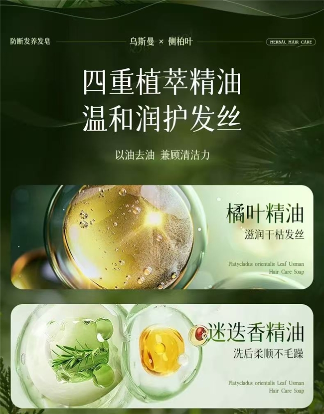 (1)日常养护(周一、周三、周五):使用侧柏叶+乌斯曼草防断养发皂,重点清洁头皮、控油去屑、强韧发根,维持头皮清爽健康,减少掉发量,适合日常清洁养护,尤其适合油头人群。