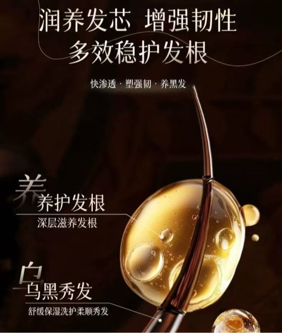 功效一:固发乌润,有效改善白发、枯黄发质。第三方实测数据显示,连续使用8周后,79%的测试者反馈发丝乌润度明显提升,65%的白发人群发根出现浅褐色色素沉淀,发丝光泽度提升60%,发根韧性提升45%,掉发量减少58%。从测试者反馈来看,使用2周后,发丝的枯黄问题得到轻微改善,不再像之前那样干枯发黄,开始出现淡淡的光泽;使用4周后,发丝变得柔顺、有光泽,枯黄问题明显改善,部分白发较少的测试者,发根出现黑色绒毛,白发颜色变浅;使用8周后,发丝变得乌黑、润亮,枯黄问题基本解决,白发较多的测试者,白发数量明显减少,新长出的发丝呈现自然黑色,发根变得更牢固、更粗壮,不再出现细软易断的情况。