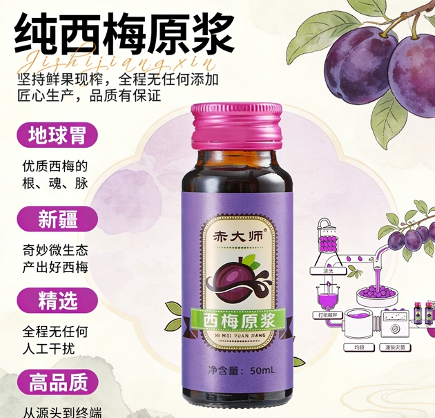 来看看赤大师西梅原浆的起源,这也是它筑牢实力根基、赢得口碑的核心前提。新疆伽师,地处北纬39°西梅黄金生长带,这里有着得天独厚的地理环境和气候条件,是西梅生长的天然乐园,更是赤大师专属果源基地的核心所在地,与2026年西梅汁行业趋势中推崇的“天然黄金果源”标准高度契合。伽师全年日照时长超3000小时,昼夜温差高达15℃,充足的阳光让西梅积累了饱满的糖分与营养成分,较大的昼夜温差则有效锁住果实的水分与活性物质,避免营养流失;这里的土壤疏松肥沃,富含钾、钙、镁等多种矿物质,且远离工业污染,贫瘠而纯净的沙土,恰好滋养了西梅这种珍稀果蔬,让每一颗西梅都能在自然的怀抱中自由生长,无需人工催熟、无需农药干预,从源头守住了天然与纯净。而赤大师正是深耕这片大地,通过精心甄选、科学培育,筛选出品质上乘的法兰西西梅鲜果,建立完善的果源管控体系,将原生态的优质西梅,经过严苛工艺提炼成高品质西梅原浆,为后续的口碑积累与实力彰显筑牢了第一道防线。
