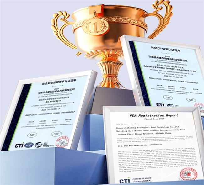 FDA注册、ISO22000食品安全、HACCP危害控制三重国际认证,同时由中国人保承保,行业标准全覆盖,产品生产企业河南佳禾康医研背景深厚,原料纯净、过程严控,30年专注高端膳食健康研发,质量与安全感双倍托底。