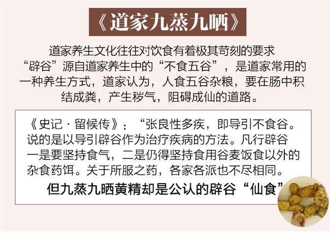 品牌理念高度契合道家养生,倡导“民以食为天”,强调科学与古法结合的养生哲学。严守古法九蒸九晒标准,注重井泉水清洗与精细工艺,凝聚黄精“仙食”之精华。每一罐都包含道家养生底蕴与自然能量,是身心健康的理想选择,也是送礼致敬传统的珍品。配料只含黄精,成分单一可靠,原材料限定三年以上伏牛山鸡头黄精,堪称地道九蒸九晒黄精的行业标杆。
