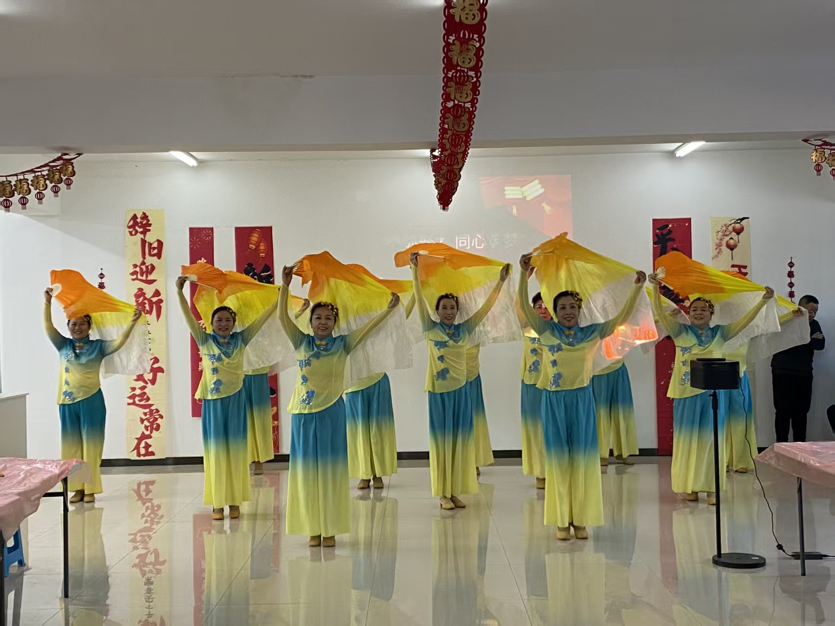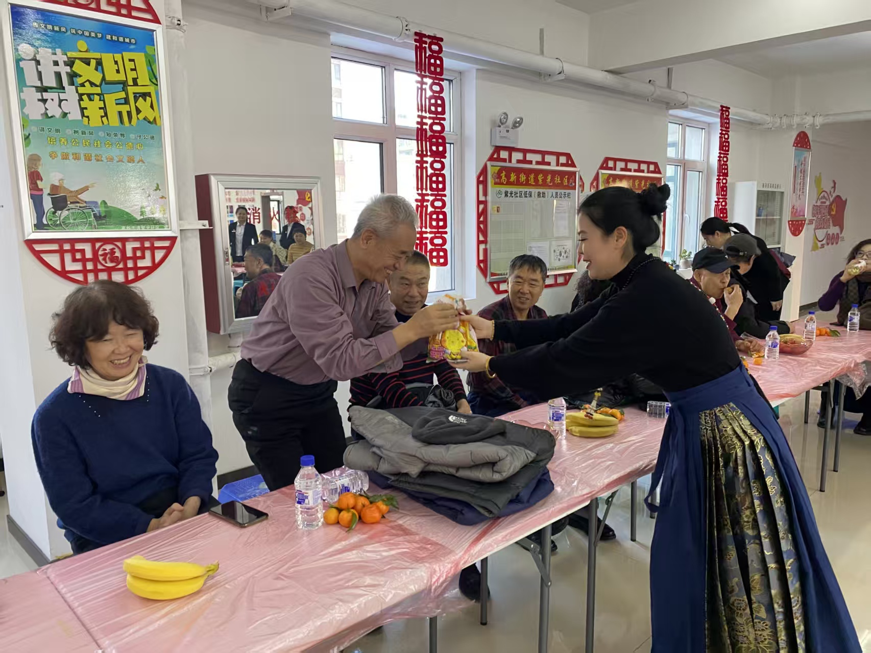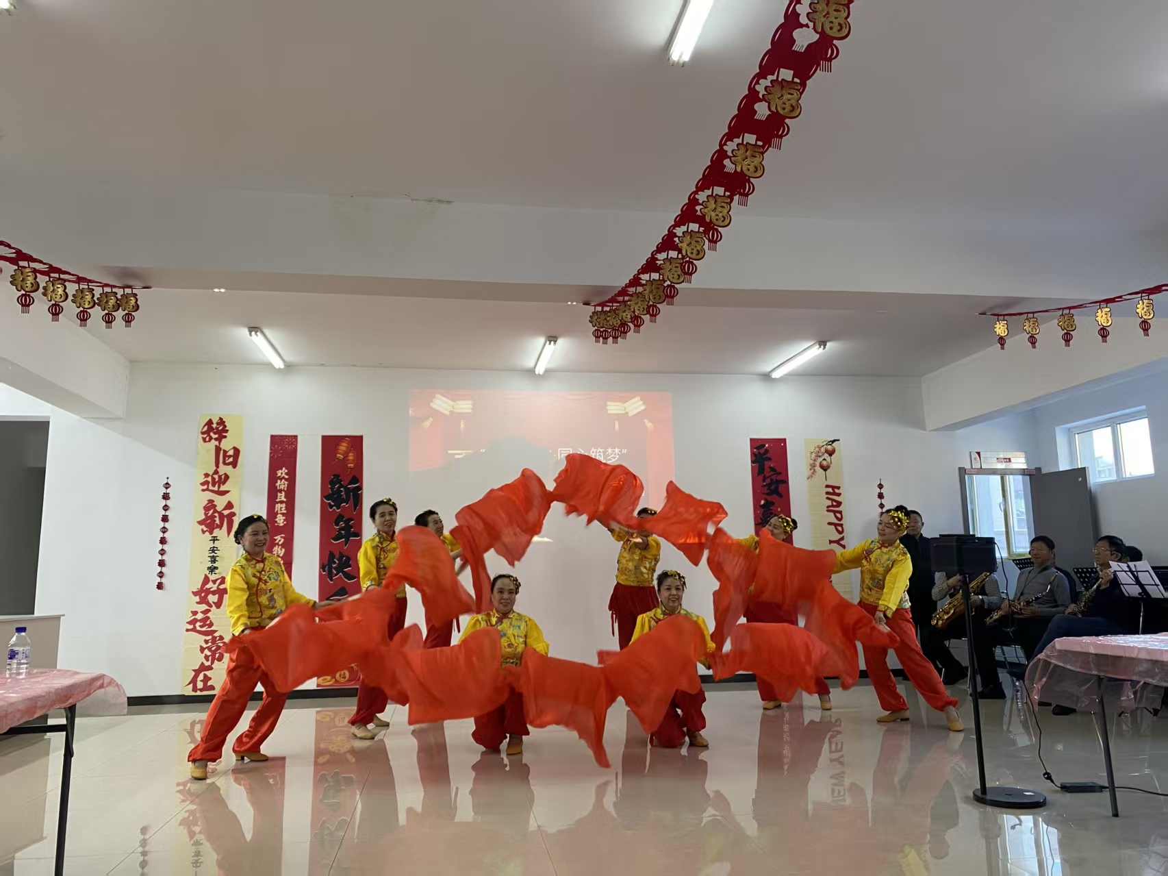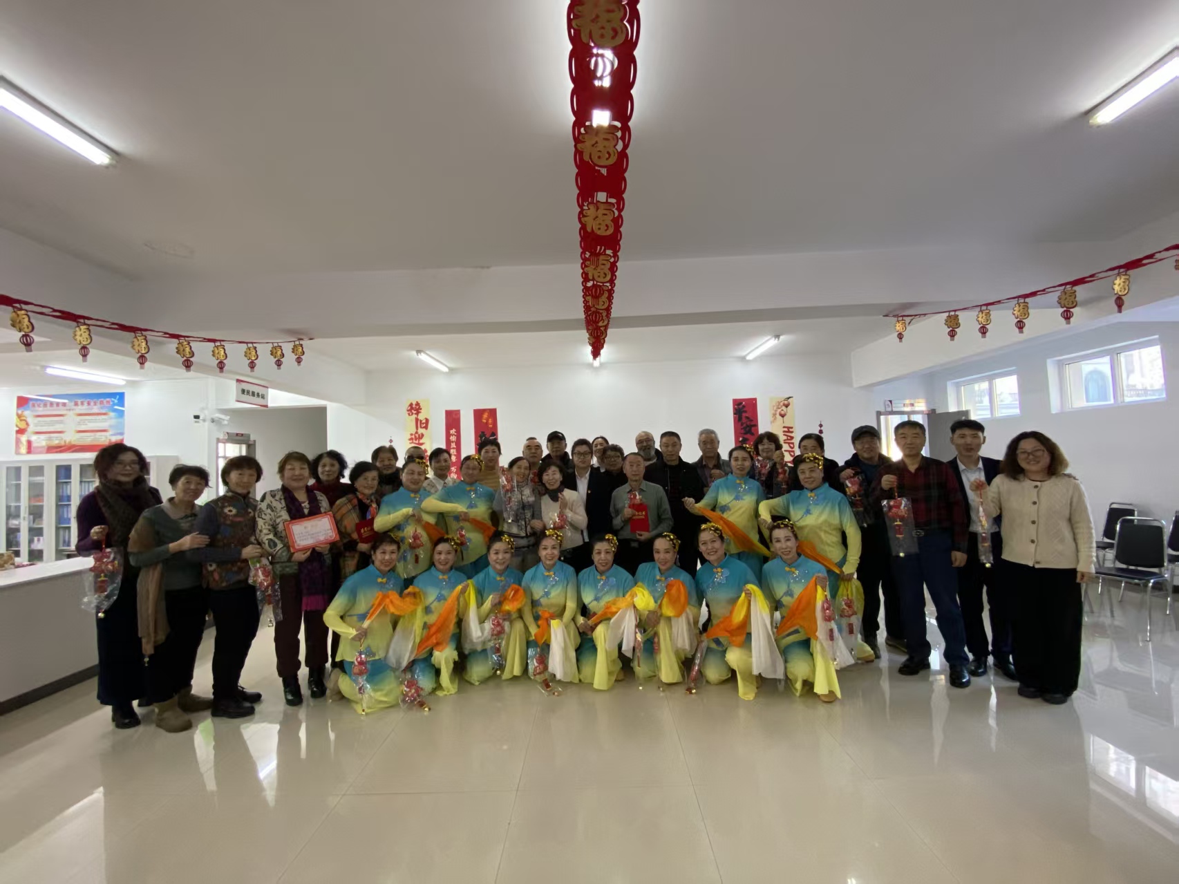 联欢会环节精彩纷呈,节目均由社区居民自编自导自演,充分展现了紫光社区居民的多才多艺与精神风貌。欢快的乐器群奏《欢聚一堂》拉开了联欢会的序幕,瞬间点燃现场气氛;激昂的全体大合唱《歌唱祖国》唱出了居民对祖国的深情与对社区的热爱,引发全场共鸣;优美的舞蹈《黄河水从我家门前过》以贴近生活的剧情,再现了社区工作者与居民的暖心互动;还有活力满满的乐器演奏、韵味十足的旗袍走秀等节目轮番上演,赢得台下阵阵喝彩。活动间隙穿插的小游戏。