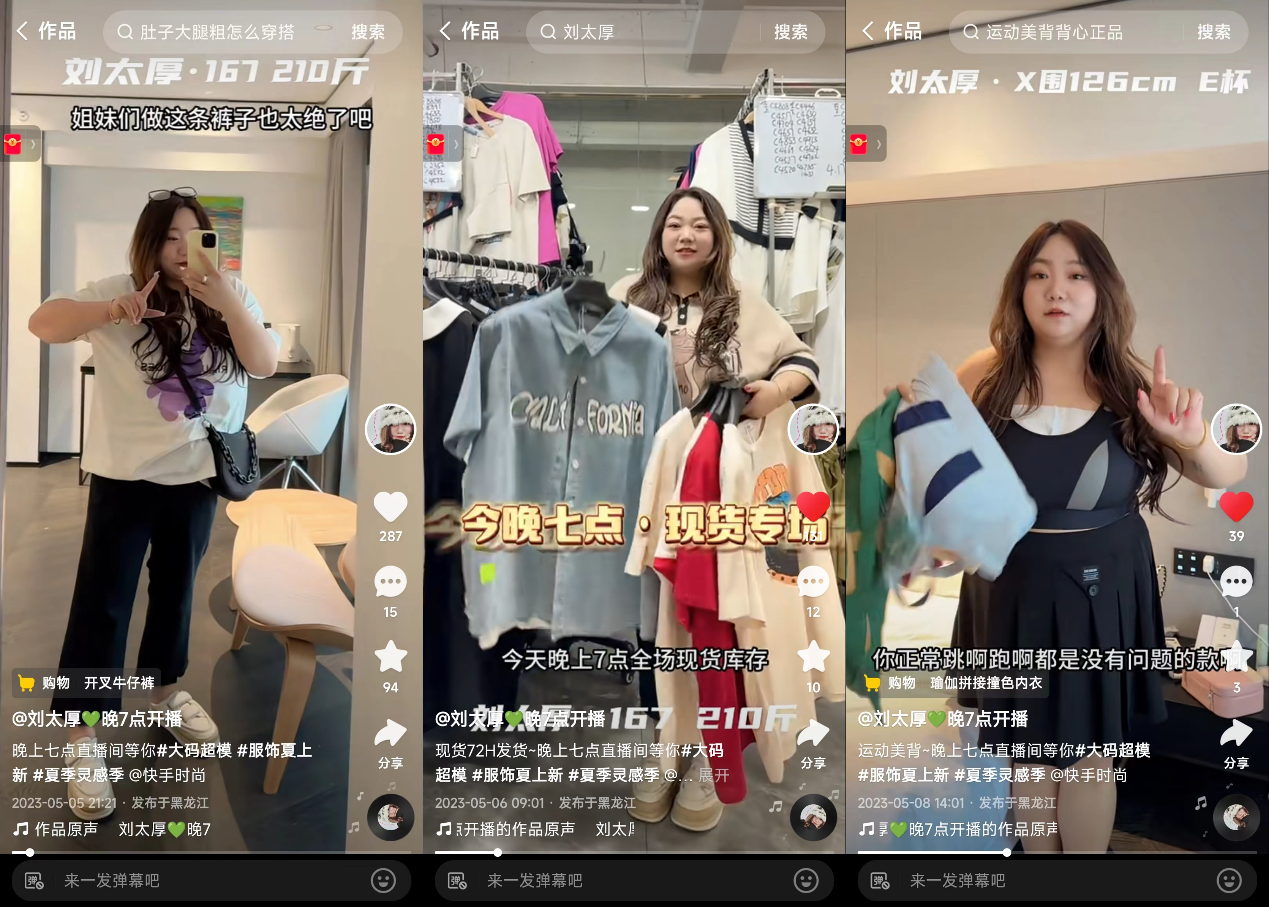 对于自己中意的衣服版型,刘蕊一次次去调整细节设计、面料,将大众化的服装调整为更适合胖女孩身材的大码款式。随着刘蕊服装生意的发展,她拥有了自己的工厂,从源头把控服装的款式和质量。在短视频直播平台快手上,刘蕊也化身大码女装主播“刘太厚”,把高性价比的大码服饰带给更多胖女孩。